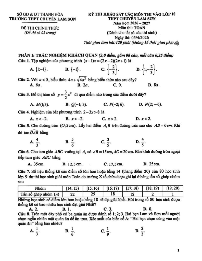 Trích dẫn Đề khảo sát Toán thi vào lớp 10 năm 2026 – 2027 trường chuyên Lam Sơn – Thanh Hóa: