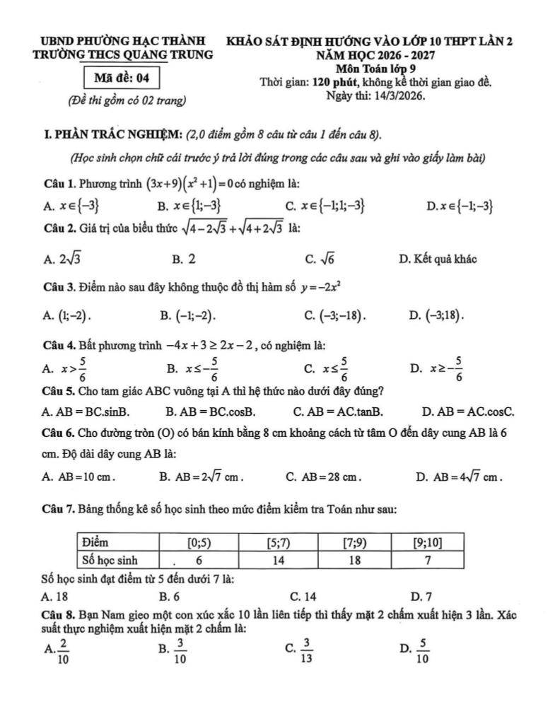 Trích dẫn Đề khảo sát Toán vào 10 lần 2 năm 2026 – 2027 trường THCS Quang Trung – Thanh Hóa: