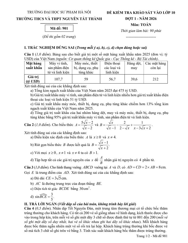 MonToan.com.vn giới thiệu đến quý thầy, cô giáo và các em học sinh đề kiểm tra khảo sát chất lượng môn Toán tuyển sinh vào lớp 10 THPT đợt 1 năm 2026 trường THCS và THPT Nguyễn Tất Thành, thành phố Hà Nội. Đề thi gồm 03 câu trắc nghiệm đúng sai (3,0 điểm) + 04 câu trắc nghiệm trả lời ngắn (2,0 điểm) + 03 câu tự luận (5,0 điểm), thời gian làm bài 90 phút, có đáp án chi tiết và hướng dẫn chấm điểm mã đề 901 – 902.