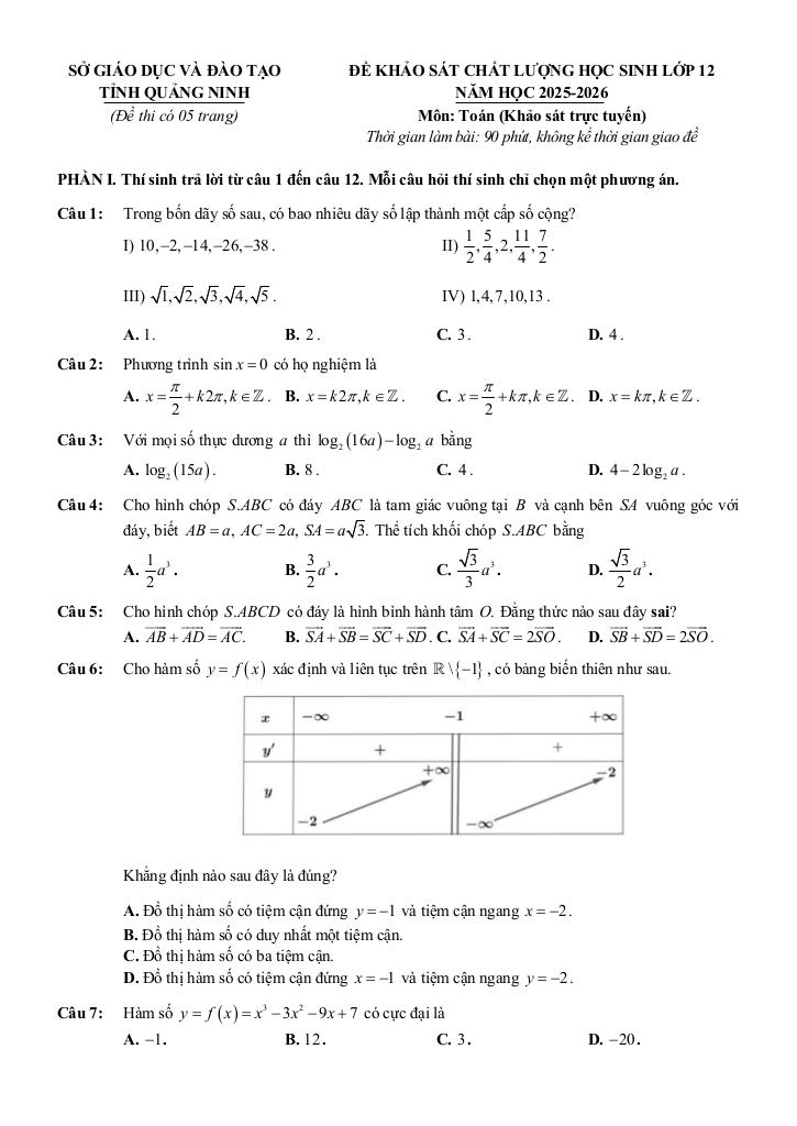 Trích dẫn Đề khảo sát trực tuyến Toán 12 năm 2025 – 2026 sở GD&ĐT Quảng Ninh: