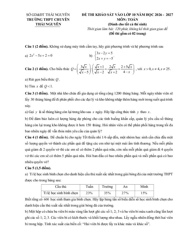 Trích dẫn Đề khảo sát vào lớp 10 môn Toán (chung) năm 2026 – 2027 trường THPT chuyên Thái Nguyên: