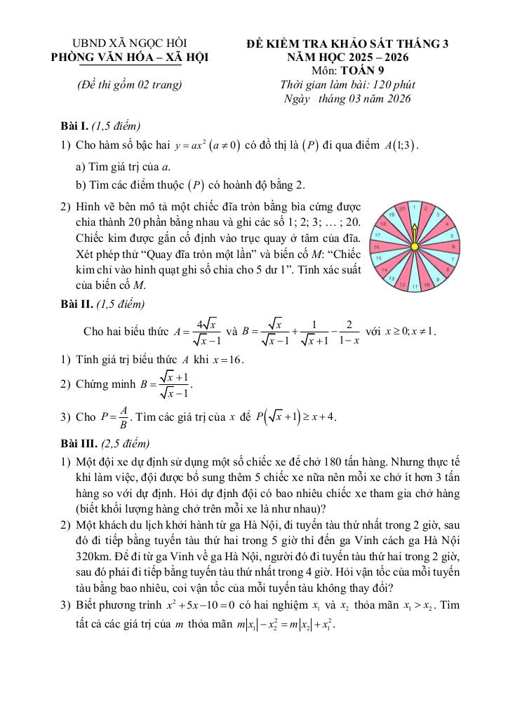 Trích dẫn Đề kiểm tra khảo sát Toán 9 tháng 3 năm 2026 xã Ngọc Hồi – Hà Nội: