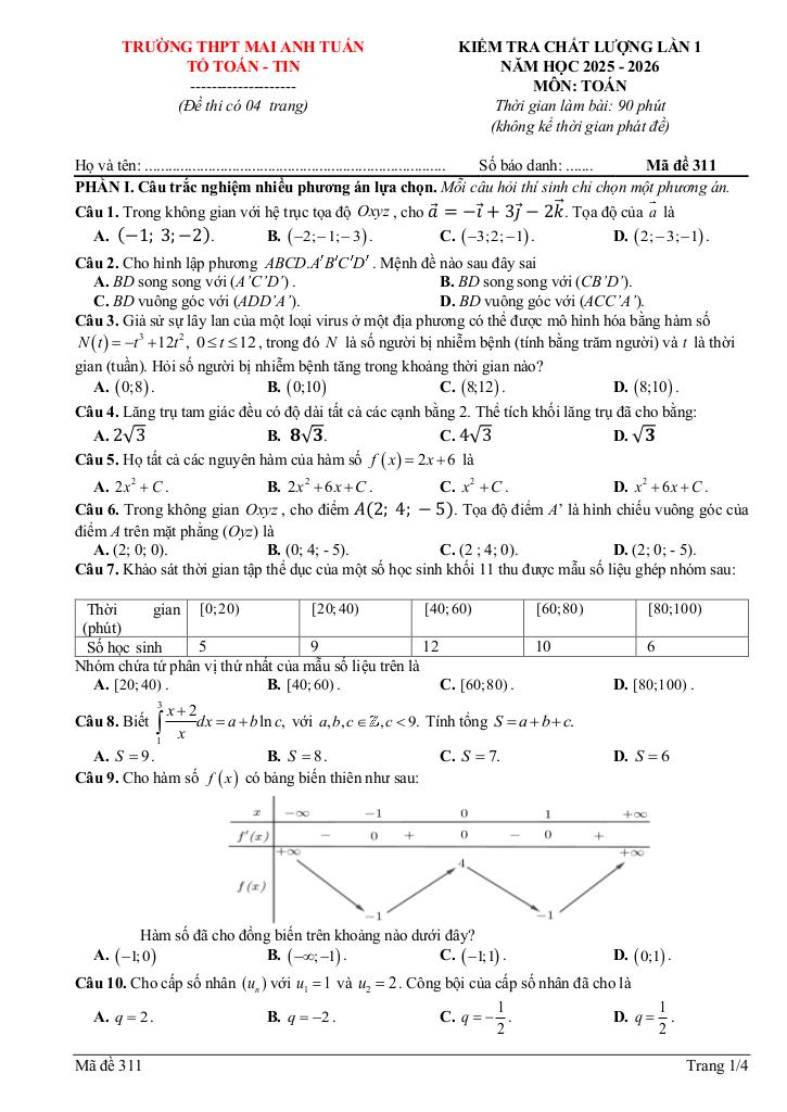 MonToan.com.vn giới thiệu đến quý thầy, cô giáo và các em học sinh đề kiểm tra chất lượng lần 1 môn Toán 12 năm học 2025 – 2026 trường THPT Mai Anh Tuấn, tỉnh Thanh Hóa. Đề thi gồm 12 câu trắc nghiệm nhiều phương án lựa chọn (3,0 điểm) + 04 câu trắc nghiệm đúng sai (4,0 điểm) + 06 câu trắc nghiệm trả lời ngắn (3,0 điểm), thời gian làm bài 90 phút, có đáp án và lời giải chi tiết mã đề 311 – 312.