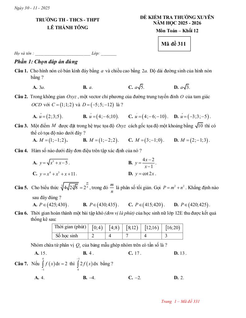 Trích dẫn Đề kiểm tra thường xuyên Toán 12 năm 2025 – 2026 trường Lê Thánh Tông – TP HCM:
