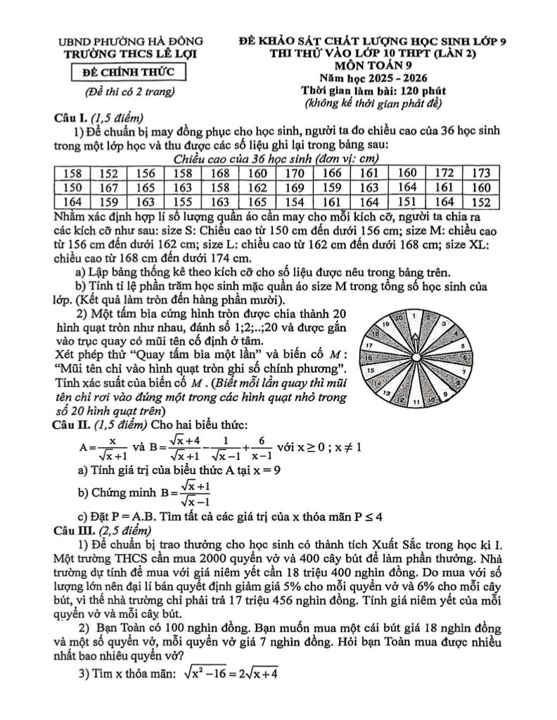 Trích dẫn Đề KSCL thi thử vào lớp 10 môn Toán lần 2 năm 2026 trường THCS Lê Lợi – Hà Nội: