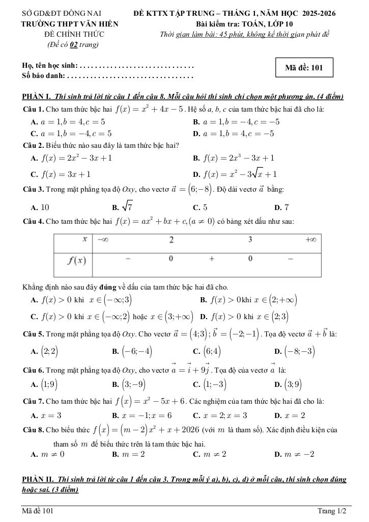 Quý thầy cô và học sinh đang tham khảo đề kttx tập trung toán 10 tháng 1 năm 2026 trường thpt văn hiến – đồng nai, bộ đề thi được xây dựng bám sát chuẩn môn toán cập nhật nhất. Cấu trúc đề bảo đảm độ phủ kiến thức đồng đều, mức độ câu hỏi được cân chỉnh từ nhận biết đến vận dụng cao, phù hợp kiểm tra toàn diện năng lực. Hãy khai thác triệt để tài liệu này để đánh giá chính xác trình độ hiện tại và tối ưu chiến lược luyện thi của bạn.