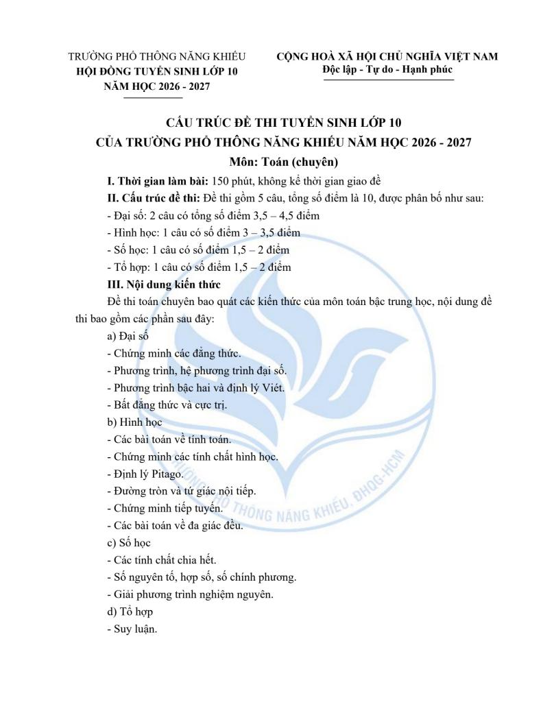 Cấu trúc Đề minh họa tuyển sinh lớp 10 môn Toán (chuyên) năm 2026 – 2027 trường PTNK – TP HCM: