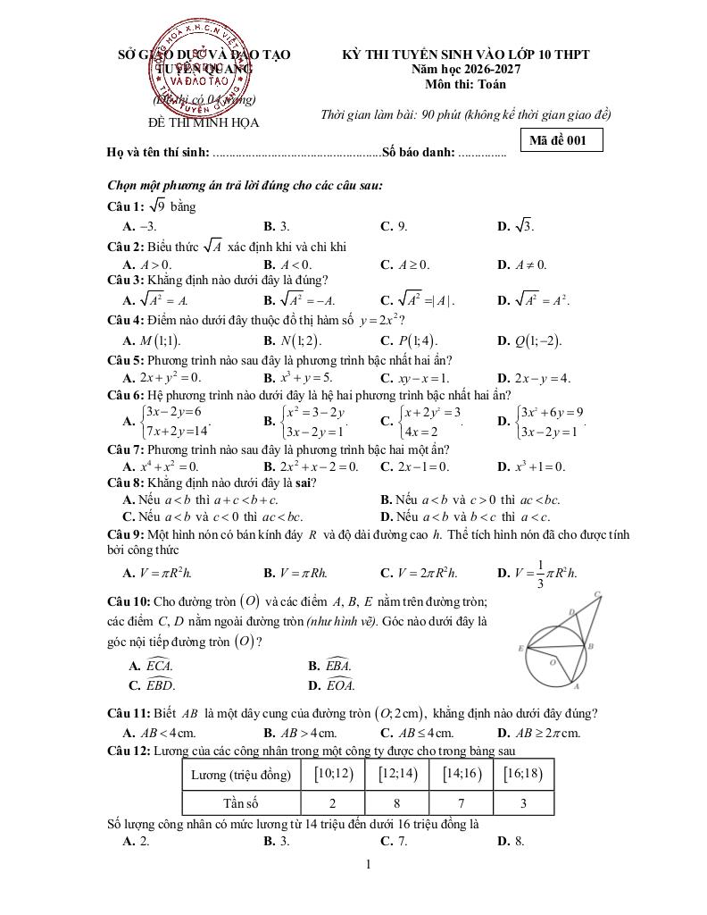 MonToan.com.vn giới thiệu đến quý thầy, cô giáo và các em học sinh đề minh họa kỳ thi tuyển sinh vào lớp 10 THPT môn Toán năm học 2026 – 2027 sở Giáo dục và Đào tạo tỉnh Tuyên Quang. Đề thi hình thức trắc nghiệm, gồm 40 câu hỏi, thời gian làm bài 90 phút, có đáp án mã đề 001.