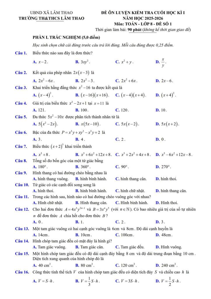 MonToan.com.vn giới thiệu đến quý thầy, cô giáo và các em học sinh đề ôn luyện kiểm tra cuối học kì 1 môn Toán 8 năm học 2025 – 2026 trường TH&THCS Lâm Thao, xã Lâm Thao, tỉnh Bắc Ninh. Đề thi hình thức 50% trắc nghiệm nhiều lựa chọn (20 câu) kết hợp với 50% tự luận (04 câu), thời gian làm bài 90 phút.