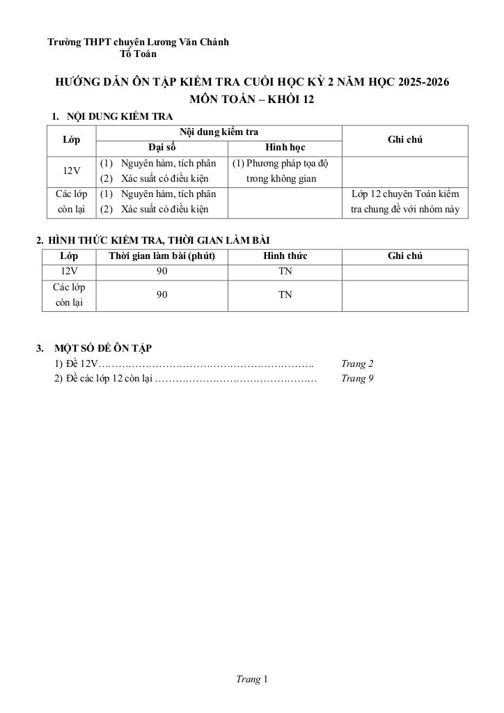 MonToan.com.vn giới thiệu đến quý thầy, cô giáo và các em học sinh đề ôn tập cuối học kỳ 2 môn Toán 12 năm học 2025 – 2026 trường THPT chuyên Lương Văn Chánh, tỉnh Đắk Lắk.