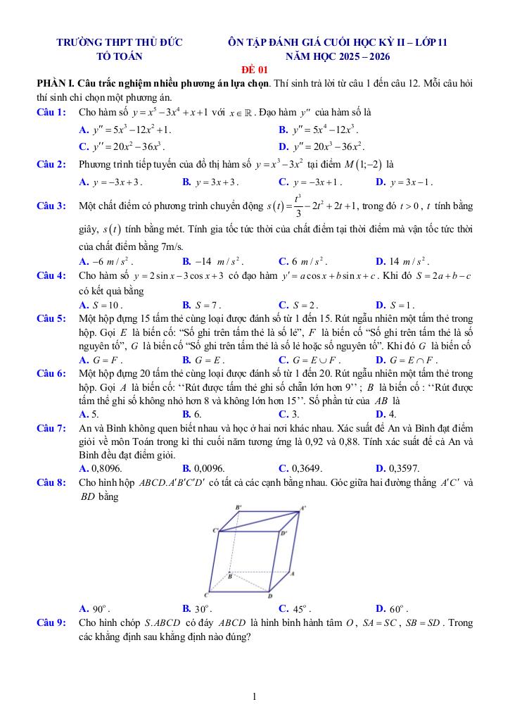 MonToan.com.vn giới thiệu đến quý thầy, cô giáo và các em học sinh đề ôn tập đánh giá định kì cuối học kỳ 2 môn Toán 11 năm học 2025 – 2026 trường THPT Thủ Đức, thành phố Hồ Chí Minh. Đề thi gồm 12 câu trắc nghiệm nhiều phương án lựa chọn (3,0 điểm) + 02 câu trắc nghiệm đúng sai (2,0 điểm) + 04 câu trắc nghiệm trả lời ngắn (2,0 điểm) + 03 câu tự luận (3,0 điểm), thời gian làm bài 90 phút.