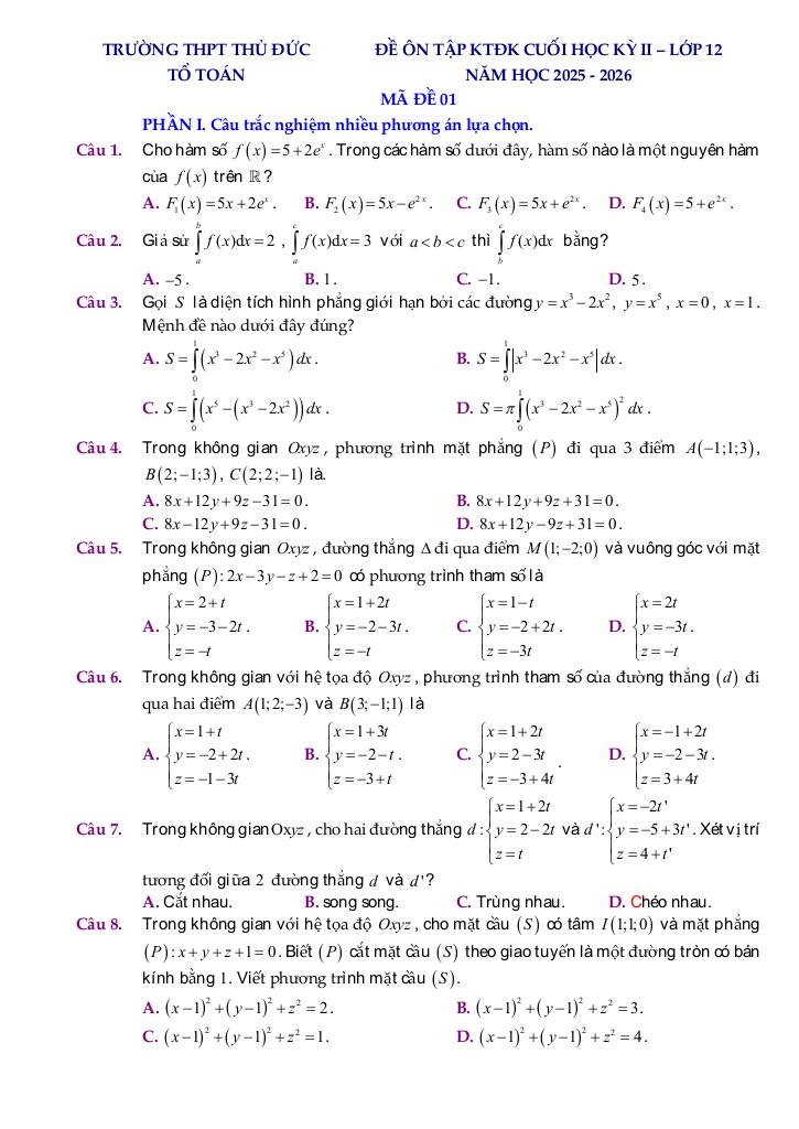 Quý thầy cô và học sinh đang tham khảo đề ôn tập cuối học kỳ 2 toán 12 năm 2025 – 2026 trường thpt thủ đức – tp hcm, bộ đề thi được xây dựng bám sát chuẩn học toán cập nhật nhất. Cấu trúc đề bảo đảm độ phủ kiến thức đồng đều, mức độ câu hỏi được cân chỉnh từ nhận biết đến vận dụng cao, phù hợp kiểm tra toàn diện năng lực. Hãy khai thác triệt để tài liệu này để đánh giá chính xác trình độ hiện tại và tối ưu chiến lược luyện thi của bạn.