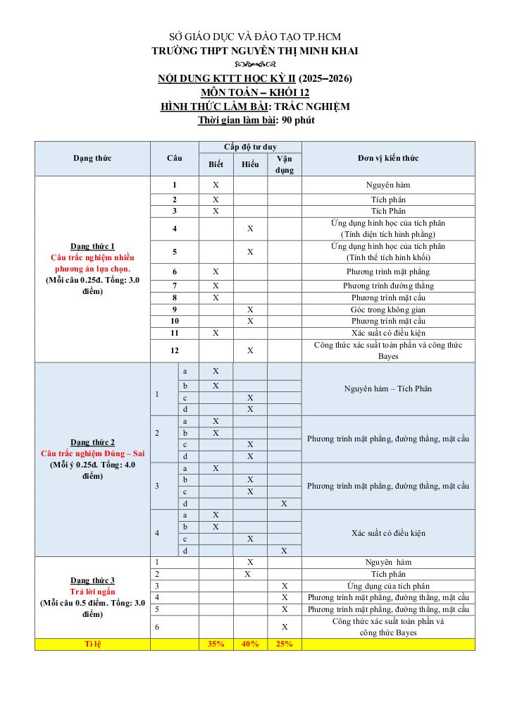 MonToan.com.vn giới thiệu đến quý thầy, cô giáo và các em học sinh đề ôn tập kiểm tra cuối học kỳ 2 môn Toán 12 năm học 2025 – 2026 trường THPT Nguyễn Thị Minh Khai, thành phố Hồ Chí Minh.