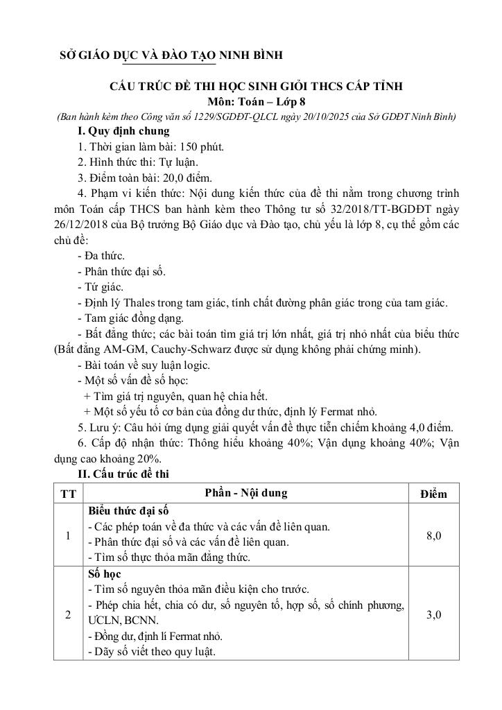 CẤU TRÚC ĐỀ THI HỌC SINH GIỎI THCS CẤP TỈNH MÔN TOÁN LỚP 8 (Ban hành kèm theo Công văn số 1229/SGDĐT-QLCL ngày 20/10/2025 của Sở GDĐT Ninh Bình):