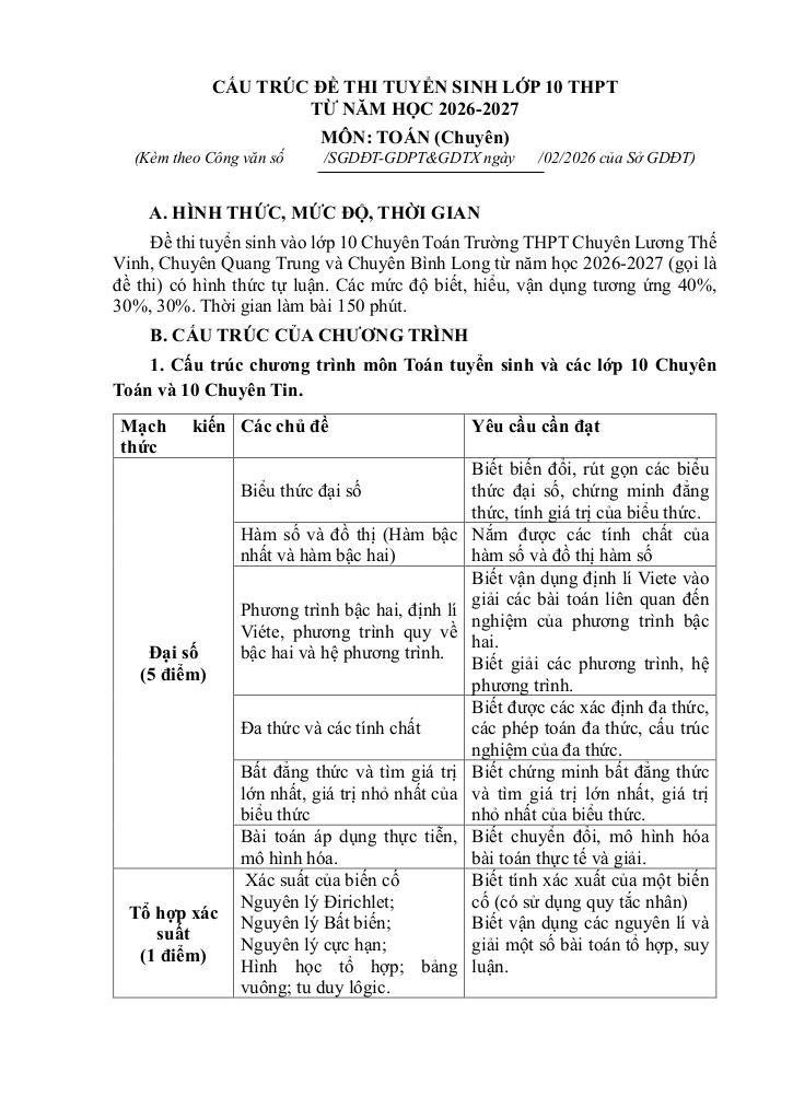 Đề thi tuyển sinh vào lớp 10 Chuyên Toán Trường THPT Chuyên Lương Thế Vinh, Chuyên Quang Trung và Chuyên Bình Long từ năm học 2026-2027 (gọi là đề thi) có hình thức tự luận. Các mức độ biết, hiểu, vận dụng tương ứng 40%, 30%, 30%. Thời gian làm bài 150 phút.
