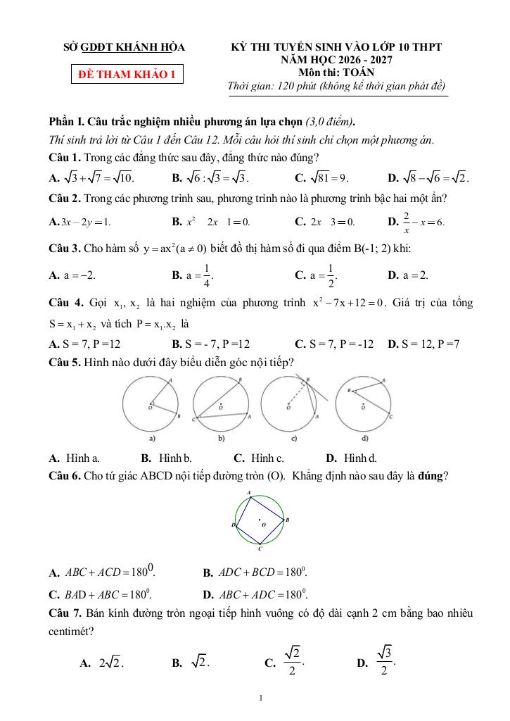 Trích dẫn Đề tham khảo tuyển sinh lớp 10 môn Toán năm 2026 – 2027 sở GD&ĐT Khánh Hòa:
