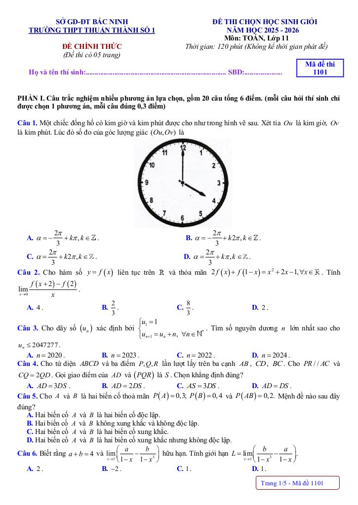 MonToan.com.vn giới thiệu đến quý thầy, cô giáo và các em học sinh đề thi chọn học sinh giỏi môn Toán 11 năm học 2025 – 2026 trường THPT Thuận Thành số 1, tỉnh Bắc Ninh. Đề thi gồm 20 câu trắc nghiệm nhiều phương án lựa chọn (6,0 điểm) + 08 câu trắc nghiệm đúng sai (8,0 điểm) + 06 câu trắc nghiệm trả lời ngắn (6,0 điểm), thời gian làm bài 120 phút, có đáp án mã đề 1101 – 1102.
