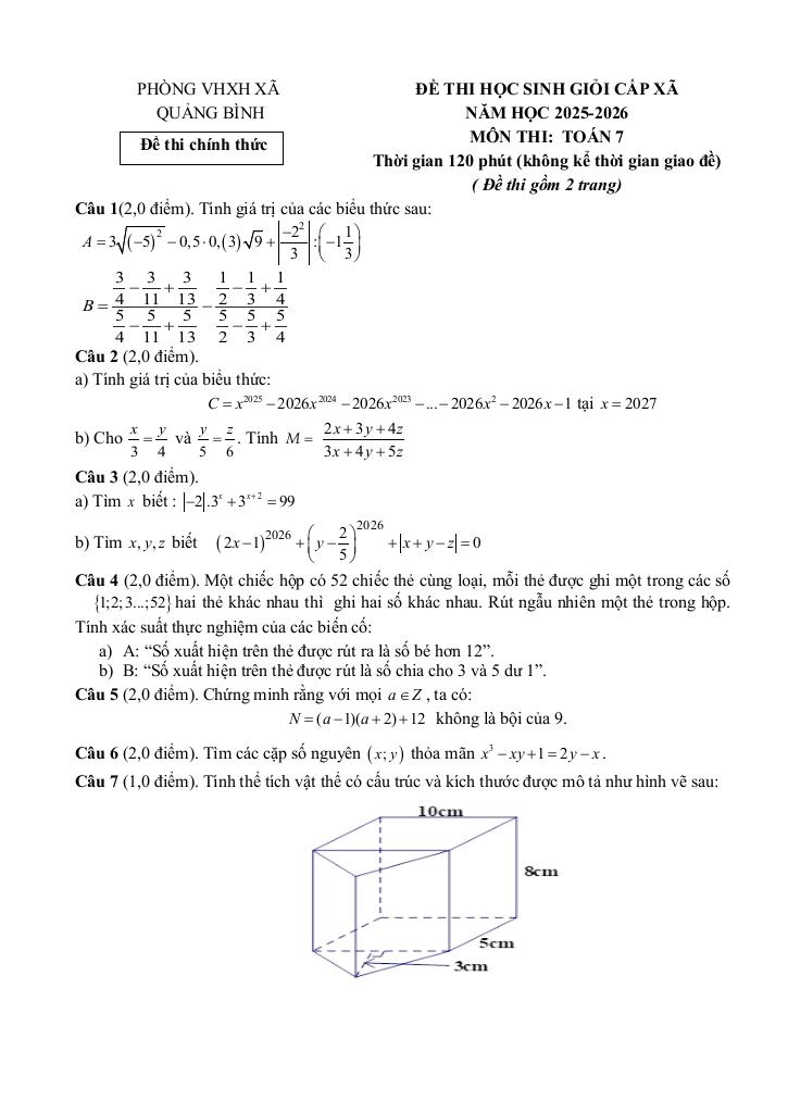 Trích dẫn Đề thi học sinh giỏi Toán 7 năm 2025 – 2026 xã Quảng Bình – Thanh Hóa: