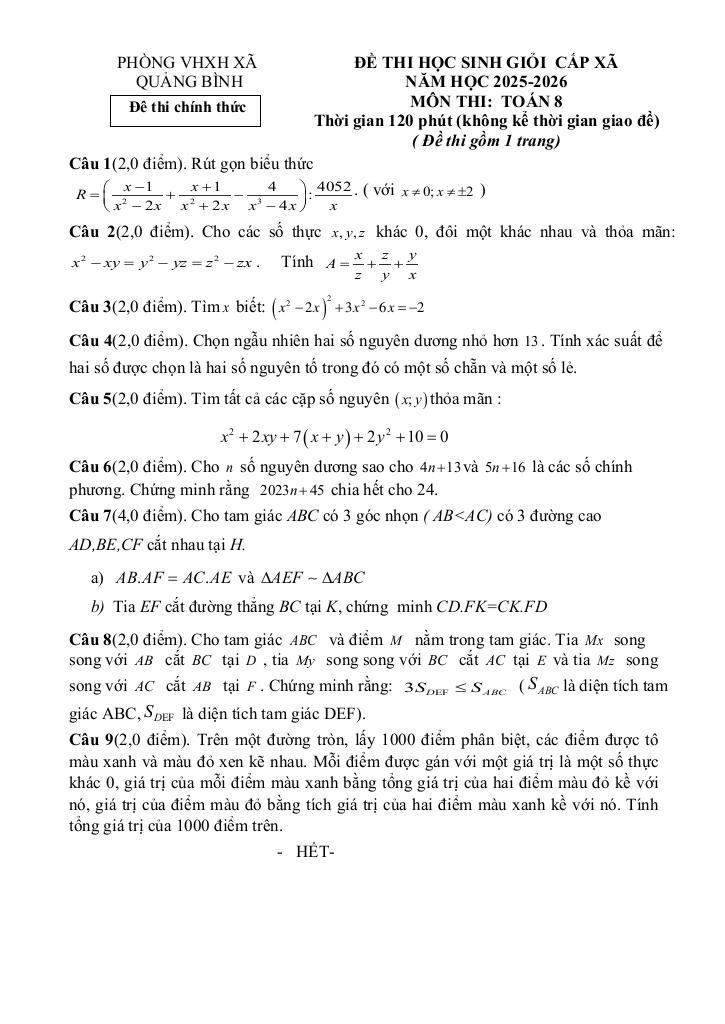 Trích dẫn Đề thi học sinh giỏi Toán 8 năm 2025 – 2026 xã Quảng Bình – Thanh Hóa: