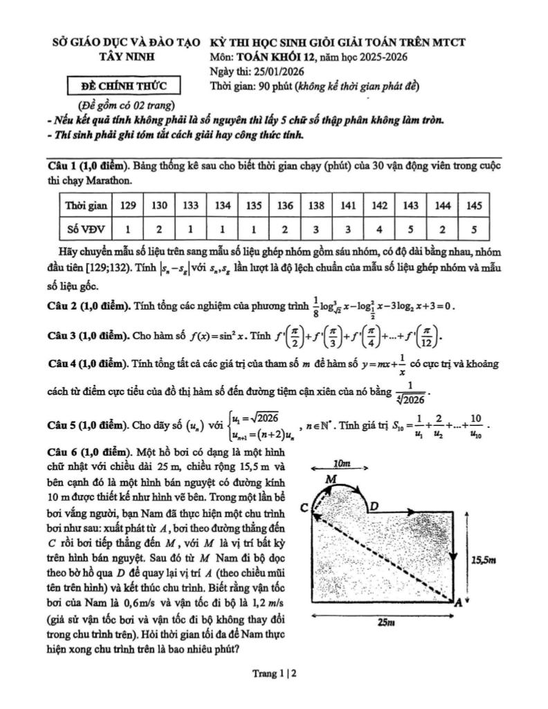 Trích dẫn Đề thi HSG giải toán trên MTCT Toán 12 năm 2025 – 2026 sở GD&ĐT Tây Ninh: