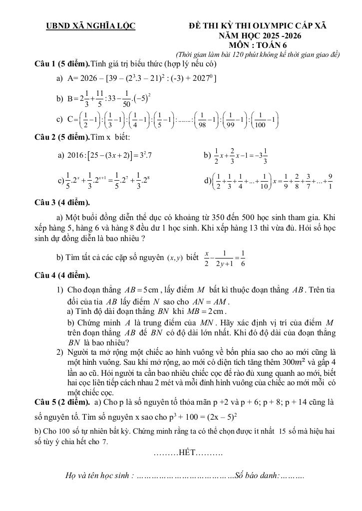 Trích dẫn Đề thi Olympic cấp xã Toán 6 năm 2025 – 2026 xã Nghĩa Lộc – Nghệ An: