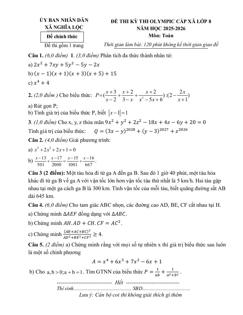 Trích dẫn Đề thi Olympic cấp xã Toán 8 năm 2025 – 2026 xã Nghĩa Lộc – Nghệ An: