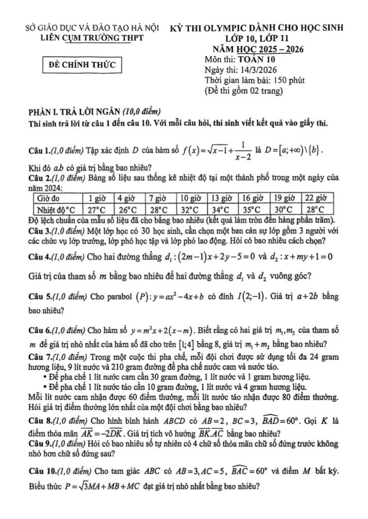 MonToan.com.vn giới thiệu đến quý thầy, cô giáo và các em học sinh đề thi Olympic dành cho học sinh môn Toán 10 năm học 2025 – 2026 liên cụm trường THPT, thành phố Hà Nội. Kỳ thi được diễn ra vào ngày 14 tháng 03 năm 2026.