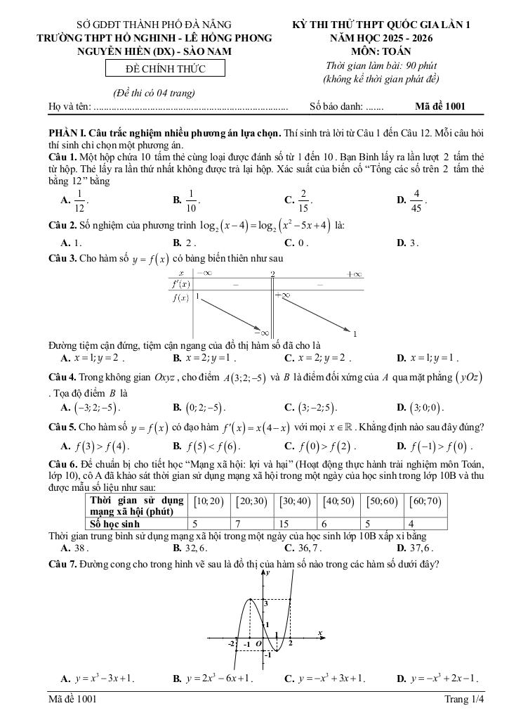 Trích dẫn Đề thi thử THPT Quốc gia 2026 môn Toán lần 1 cụm 4 trường THPT – Đà Nẵng: