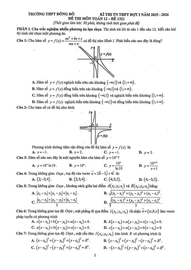 Trích dẫn Đề thi thử TN THPT 2026 đợt 1 môn Toán trường THPT Đông Đô – Hà Nội: