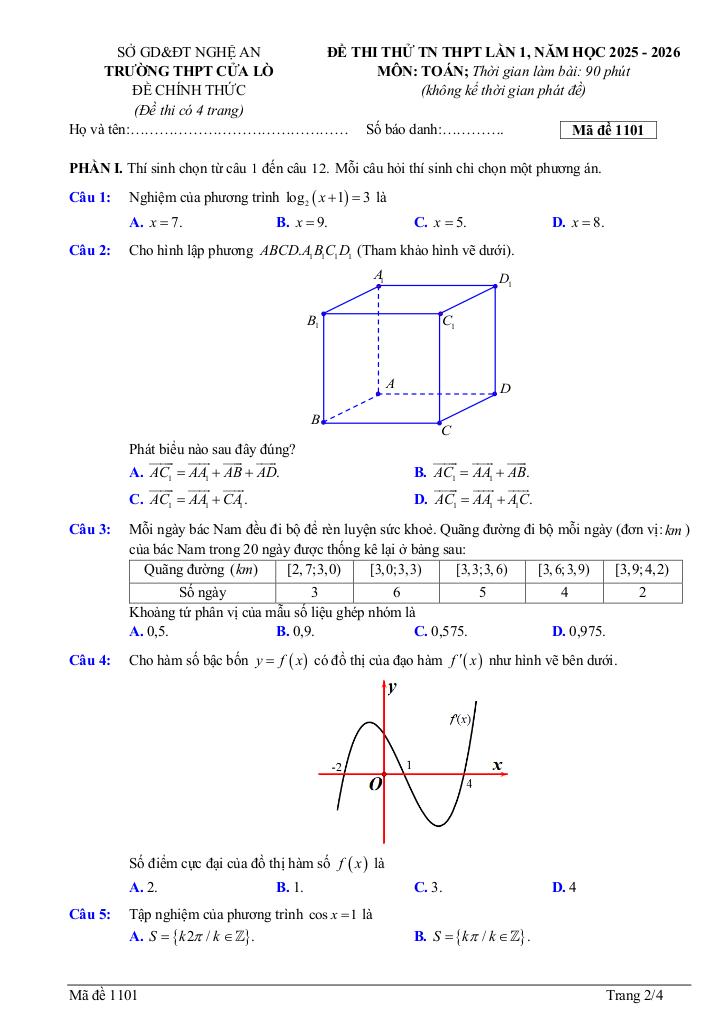 Trích dẫn Đề thi thử TN THPT 2026 lần 1 môn Toán trường THPT Cửa Lò – Nghệ An: