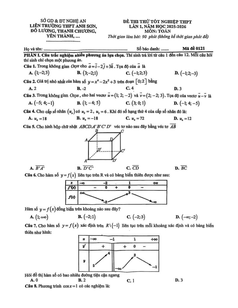 MonToan.com.vn giới thiệu đến quý thầy, cô giáo và các em học sinh đề thi thử tốt nghiệp THPT năm học 2025 – 2026 môn Toán lần 1 liên trường THPT: Anh Sơn – Đô Lương – Thanh Chương – Yên Thành, tỉnh Nghệ An. Kỳ thi được diễn ra vào ngày 31 tháng 01 năm 2026. Đề thi có đáp án tất cả các mã đề.