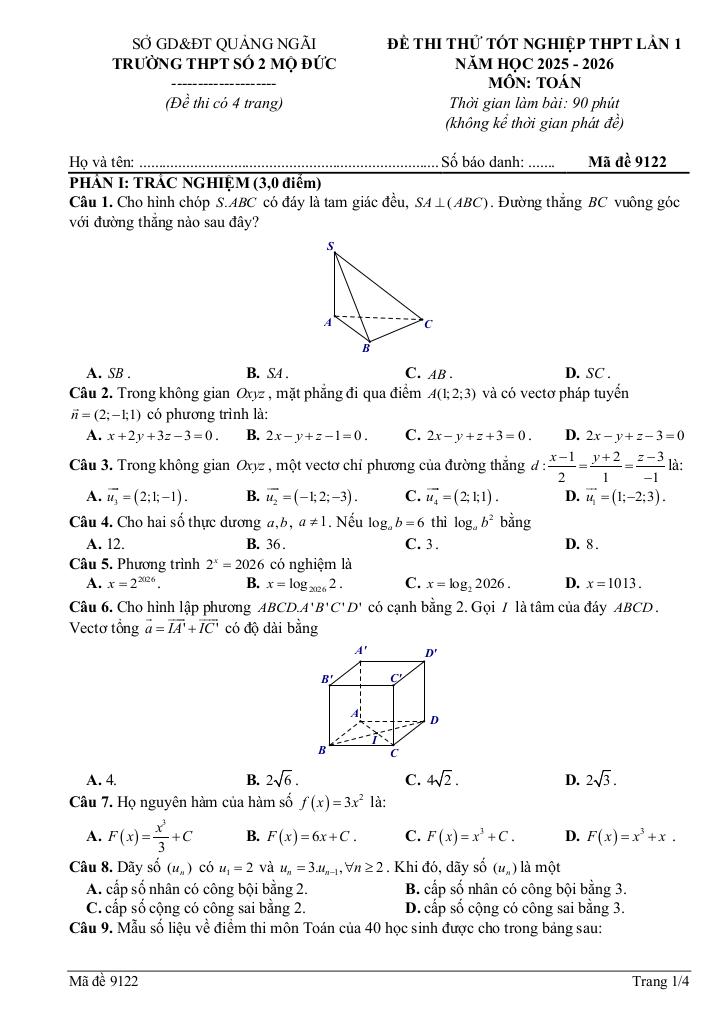 MonToan.com.vn giới thiệu đến quý thầy, cô giáo và các em học sinh đề thi thử tốt nghiệp THPT năm học 2025 – 2026 môn Toán lần 1 trường THPT Mộ Đức số 2, tỉnh Quảng Ngãi. Đề thi có đáp án mã đề 9122.
