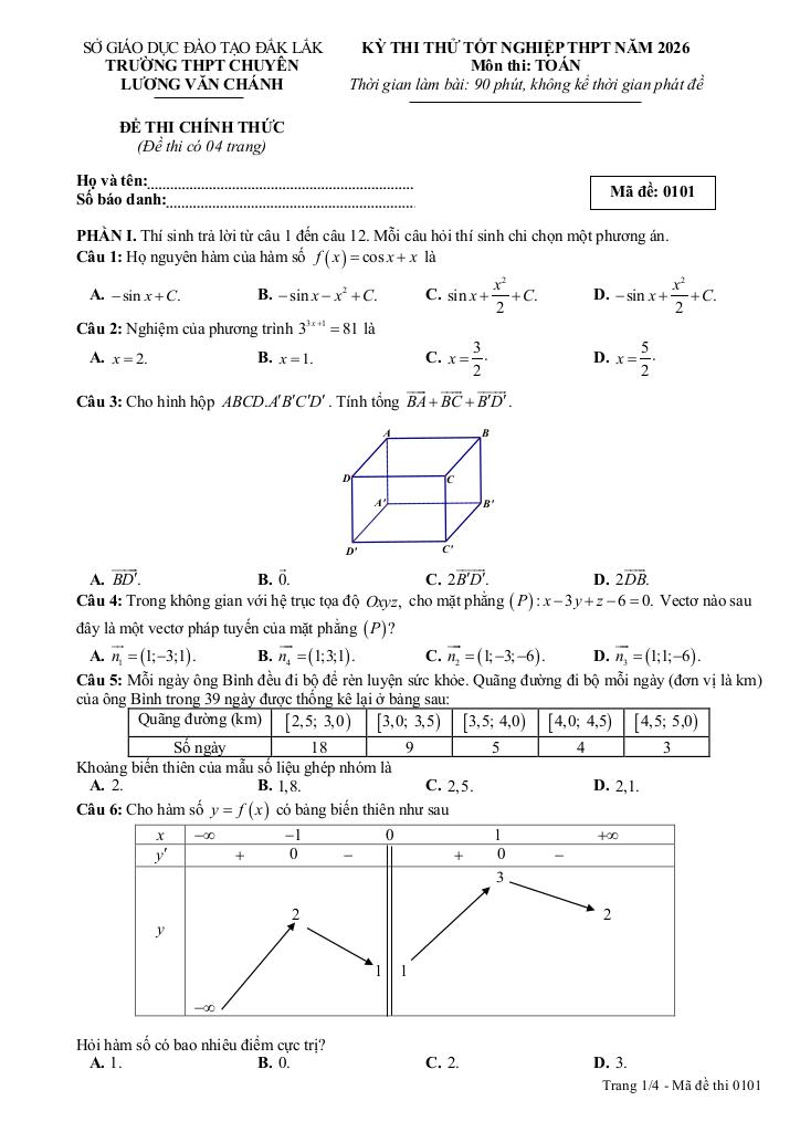 Trích dẫn Đề thi thử TN THPT 2026 môn Toán trường chuyên Lương Văn Chánh – Đắk Lắk: