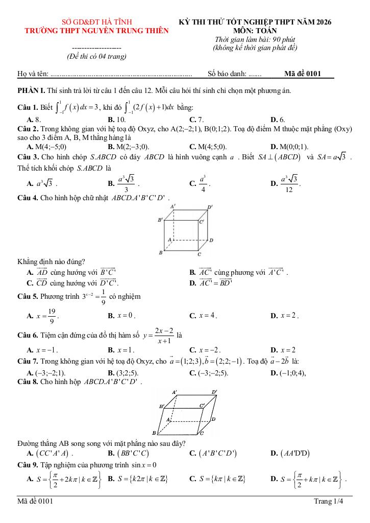 Trích dẫn Đề thi thử TN THPT 2026 môn Toán trường THPT Nguyễn Trung Thiên – Hà Tĩnh: