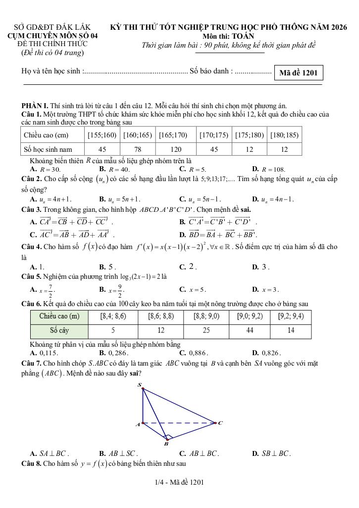 Nội dung Đề thi thử tốt nghiệp THPT 2026 môn Toán cụm chuyên môn số 04 – Đắk Lắk: