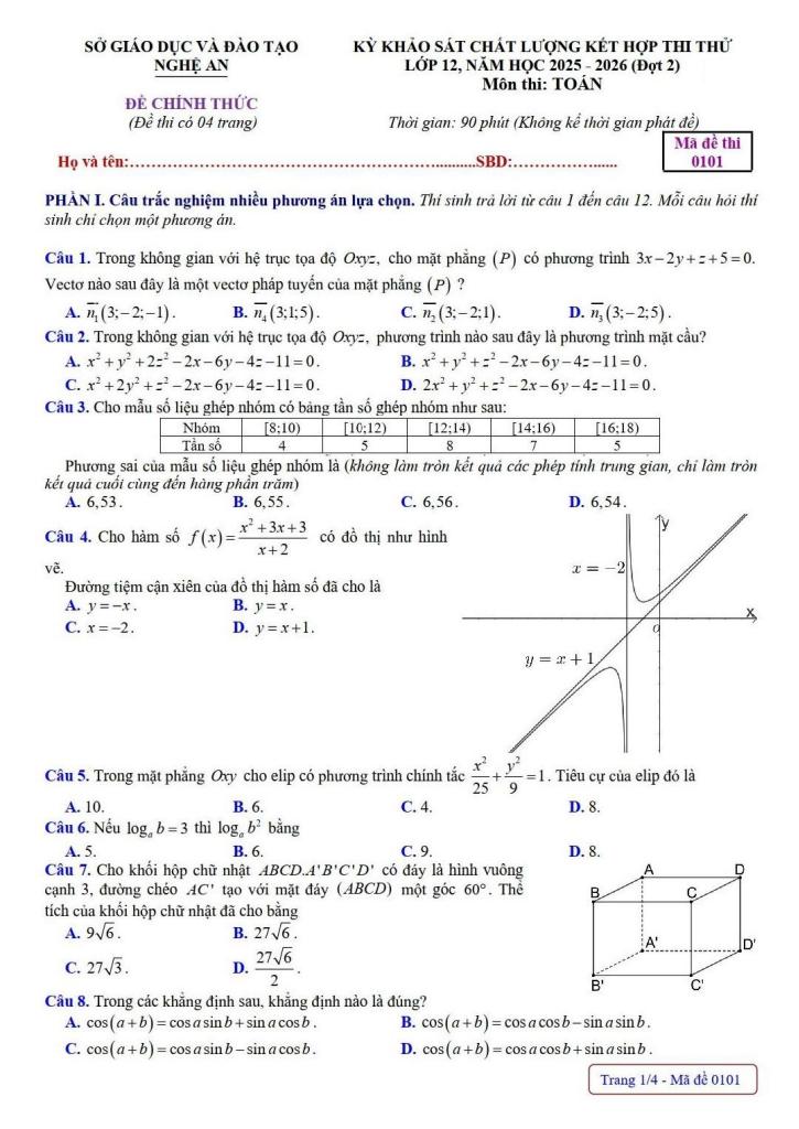 Trích dẫn Đề thi thử tốt nghiệp THPT 2026 môn Toán đợt 2 sở GD&ĐT Nghệ An: