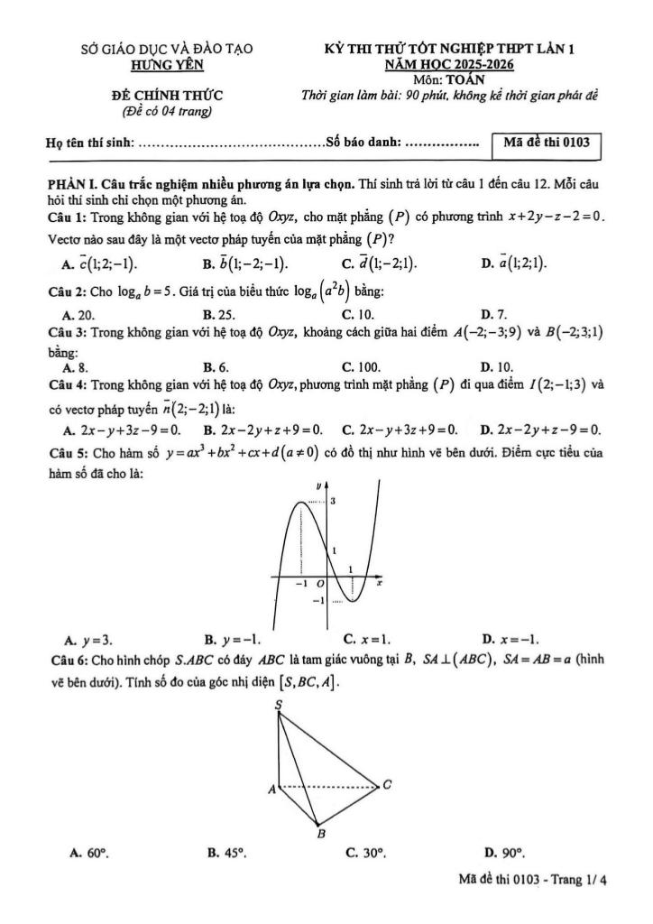 Trích dẫn Đề thi thử tốt nghiệp THPT 2026 môn Toán lần 1 sở GD&ĐT Hưng Yên: