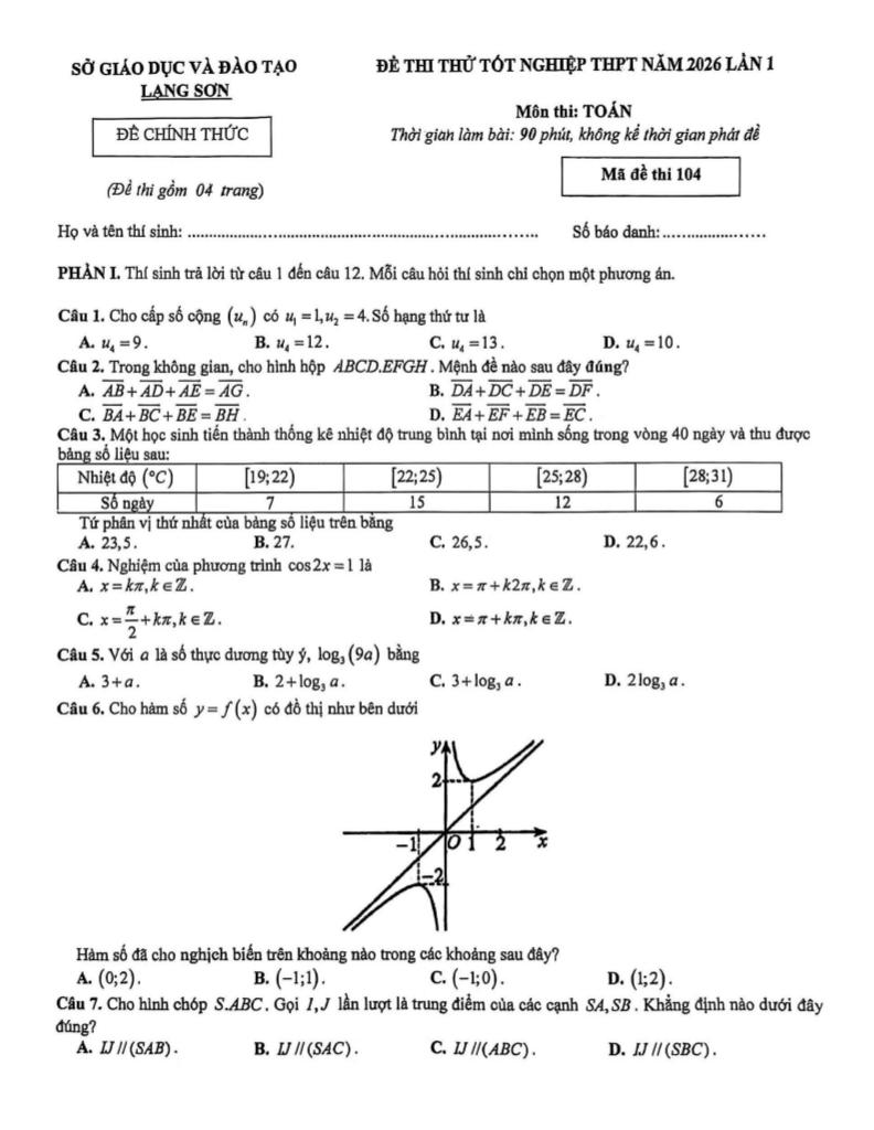 Trích dẫn Đề thi thử tốt nghiệp THPT năm 2026 lần 1 môn Toán sở GD&ĐT Lạng Sơn: