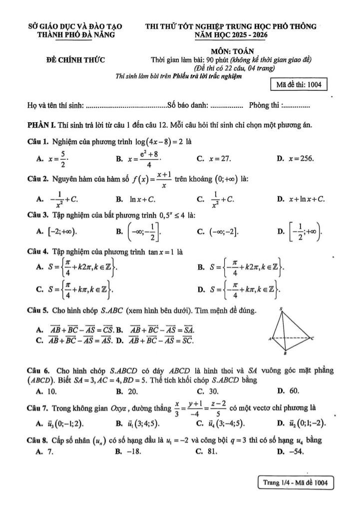 Trích dẫn Đề thi thử tốt nghiệp THPT năm 2026 môn Toán sở GD&ĐT Đà Nẵng: