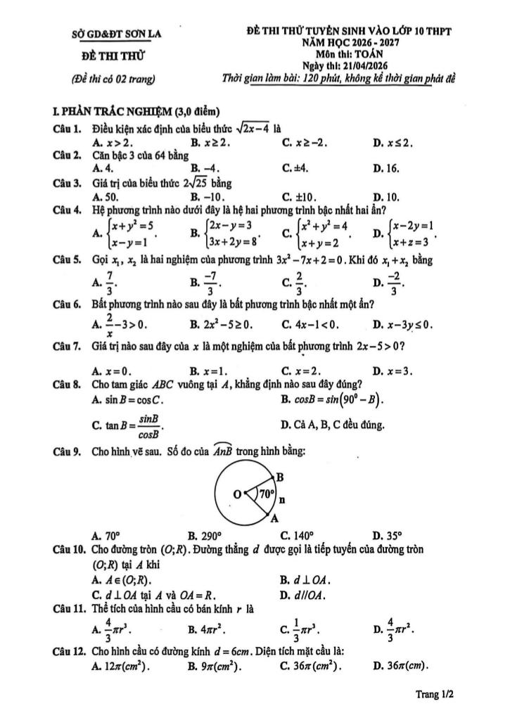Trích dẫn Đề thi thử tuyển sinh lớp 10 môn Toán năm 2026 – 2027 sở GD&ĐT Sơn La: