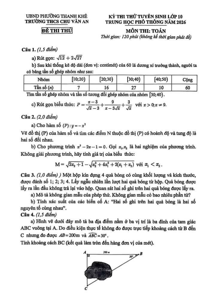 Trích dẫn Đề thi thử tuyển sinh lớp 10 môn Toán năm 2026 trường THCS Chu Văn An – Đà Nẵng: