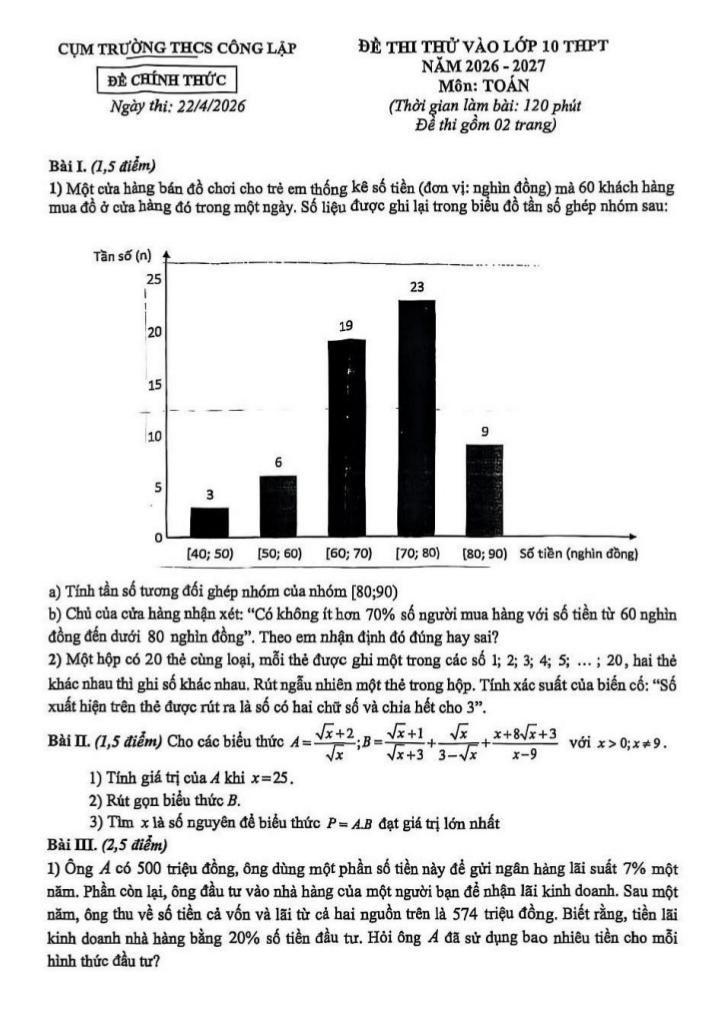 Quý thầy cô và học sinh đang tham khảo đề thi thử vào lớp 10 môn toán năm 2026 – 2027 cụm thcs công lập – hà nội, bộ đề thi được xây dựng bám sát chuẩn tài liệu toán cập nhật nhất. Cấu trúc đề bảo đảm độ phủ kiến thức đồng đều, mức độ câu hỏi được cân chỉnh từ nhận biết đến vận dụng cao, phù hợp kiểm tra toàn diện năng lực. Hãy khai thác triệt để tài liệu này để đánh giá chính xác trình độ hiện tại và tối ưu chiến lược luyện thi của bạn.