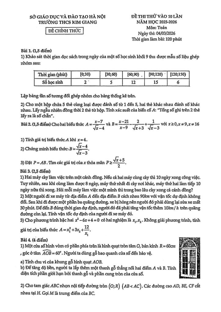 MonToan.com.vn giới thiệu đến quý thầy, cô giáo và các em học sinh đề thi thử tuyển sinh vào lớp 10 THPT môn Toán năm 2026 trường THCS Kim Giang, thành phố Hà Nội. Kỳ thi được diễn ra vào ngày 04 tháng 03 năm 2026.