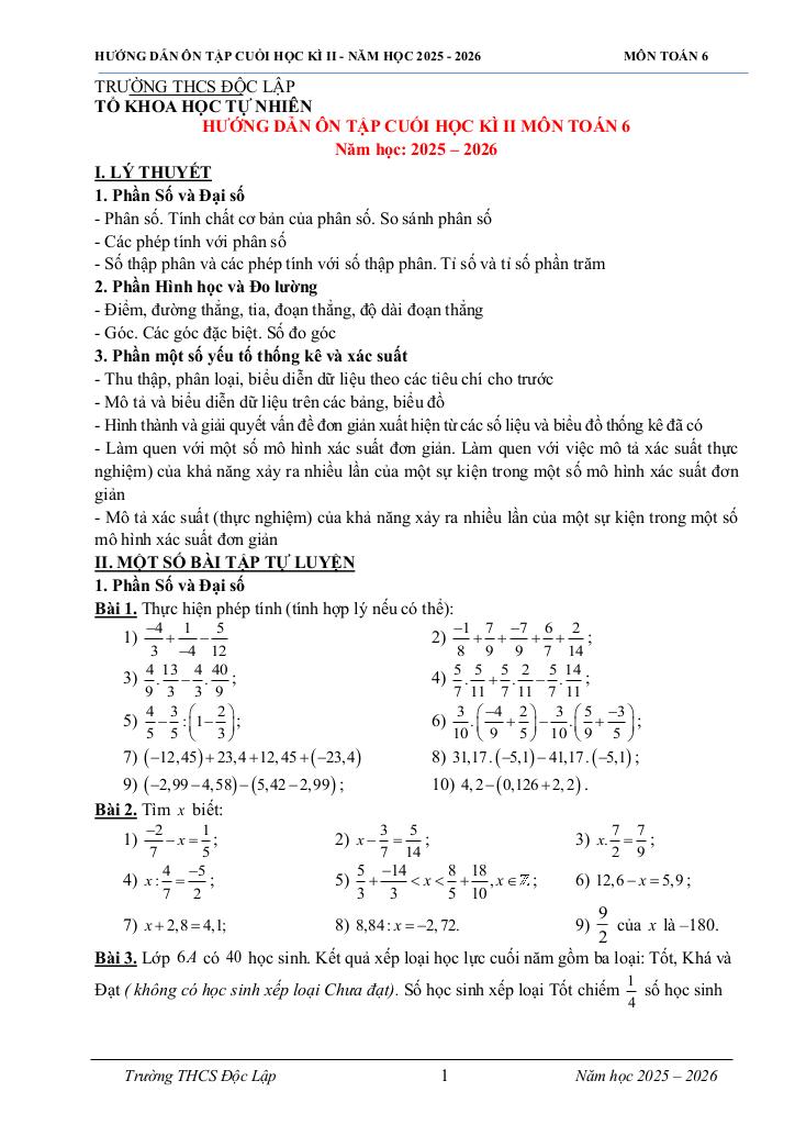MonToan.com.vn giới thiệu đến quý thầy, cô giáo và các em học sinh đề cương hướng dẫn ôn tập cuối học kì 2 môn Toán 6 năm học 2025 – 2026 trường THCS Độc Lập, tỉnh Thái Nguyên.