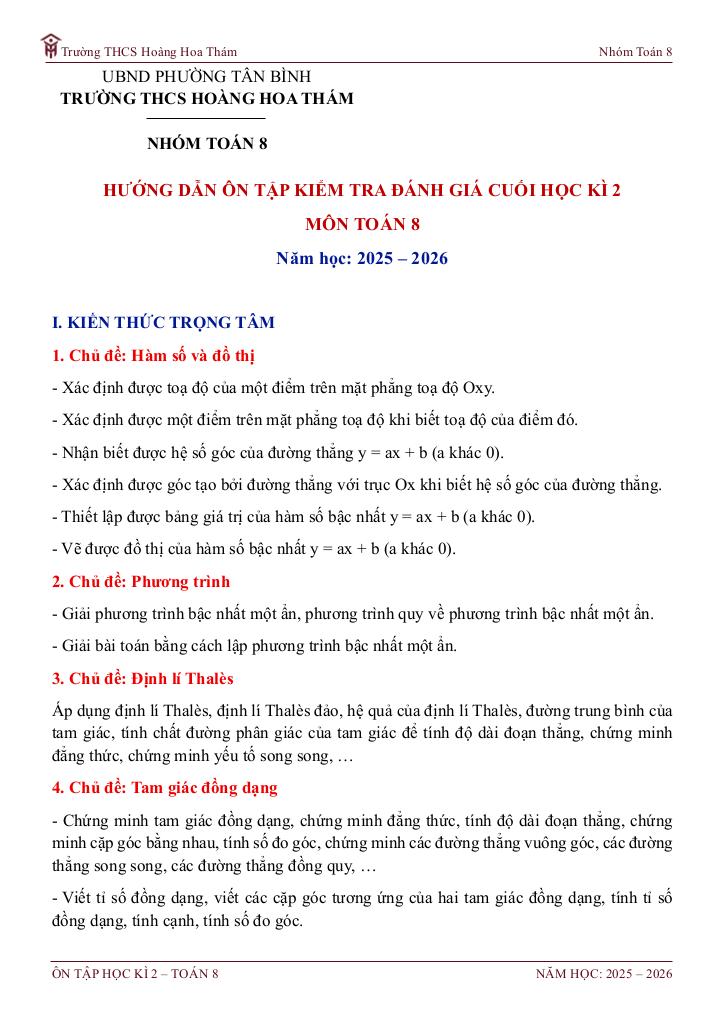 MonToan.com.vn giới thiệu đến quý thầy, cô giáo và các em học sinh đề cương hướng dẫn ôn tập kiểm tra cuối học kì 2 môn Toán 8 năm học 2025 – 2026 trường THCS Hoàng Hoa Thám, phường Tân Bình, thành phố Hồ Chí Minh.