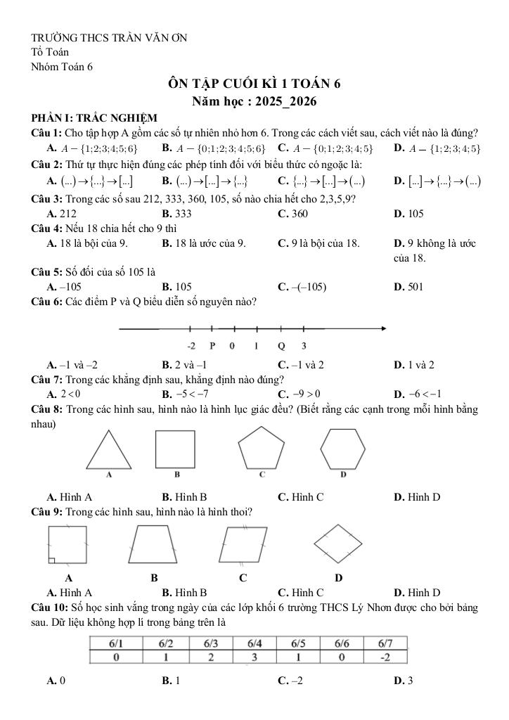 Bạn đang tiếp cận nội dung ôn tập cuối kì 1 toán 6 năm 2025 – 2026 trường thcs trần văn ơn – tp hcm thuộc chuyên mục giải toán 6 trên nền tảng đề thi toán. Bộ bài tập toán trung học cơ sở này được biên soạn chuyên sâu và bám sát chặt chẽ khung chương trình sách giáo khoa hiện hành, nhằm tối ưu hóa toàn diện quá trình ôn luyện, củng cố kiến thức Toán lớp 6 cho học sinh thông qua phương pháp tiếp cận trực quan và mang lại hiệu quả vượt trội.