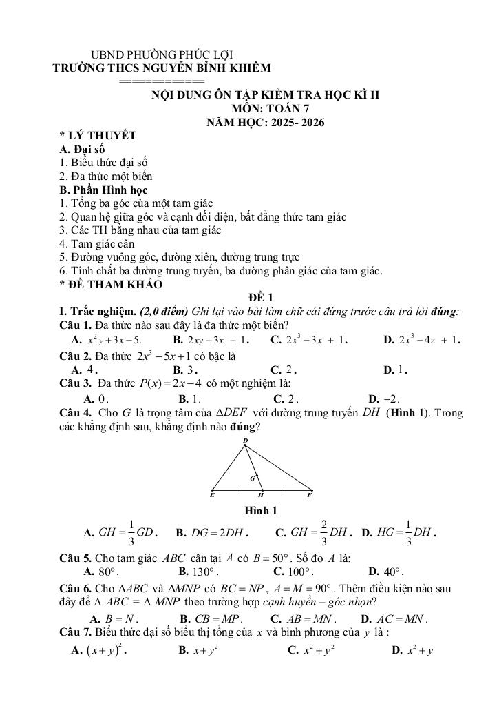MonToan.com.vn giới thiệu đến quý thầy, cô giáo và các em học sinh đề cương hướng dẫn nội dung ôn tập kiểm tra cuối học kì 2 môn Toán 7 năm học 2025 – 2026 trường THCS Nguyễn Bỉnh Khiêm, phường Phúc Lợi, thành phố Hà Nội.