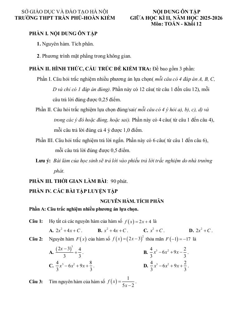 MonToan.com.vn giới thiệu đến quý thầy, cô giáo và các em học sinh đề cương hướng dẫn nội dung ôn tập giữa học kì 2 môn Toán 12 năm học 2025 – 2026 trường THPT Trần Phú – Hoàn Kiếm, thành phố Hà Nội.