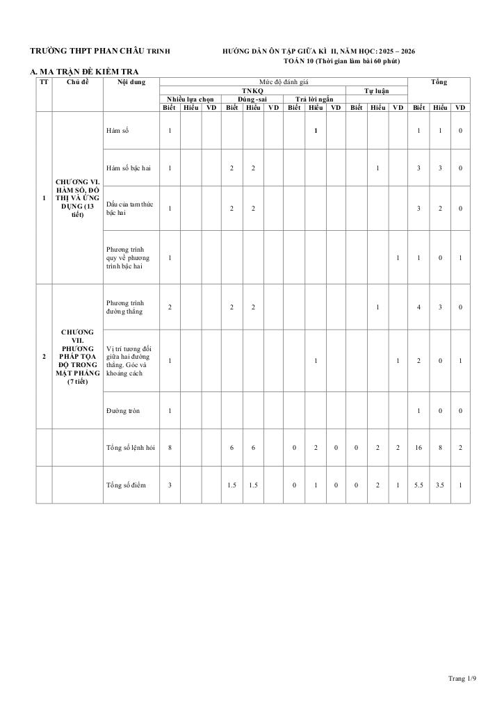 A. MA TRẬN ĐỀ KIỂM TRA