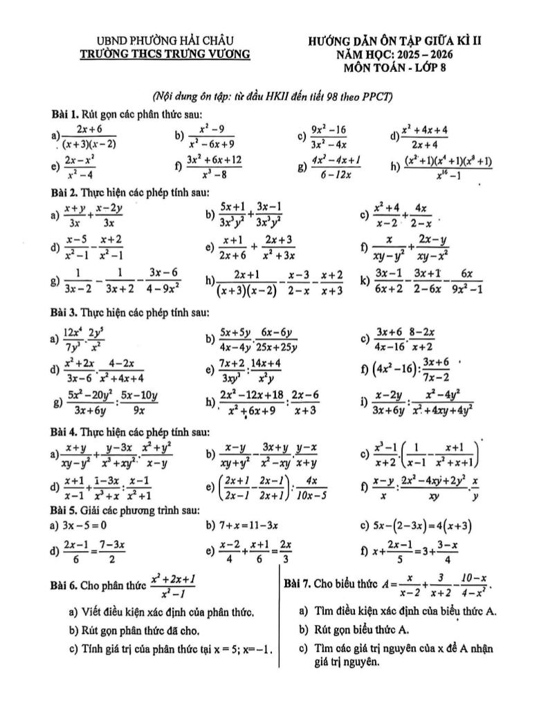 MonToan.com.vn giới thiệu đến quý thầy, cô giáo và các em học sinh đề cương hướng dẫn ôn tập giữa học kì 2 môn Toán 8 năm học 2025 – 2026 trường THCS Trưng Vương, phường Hải Châu, thành phố Đà Nẵng.